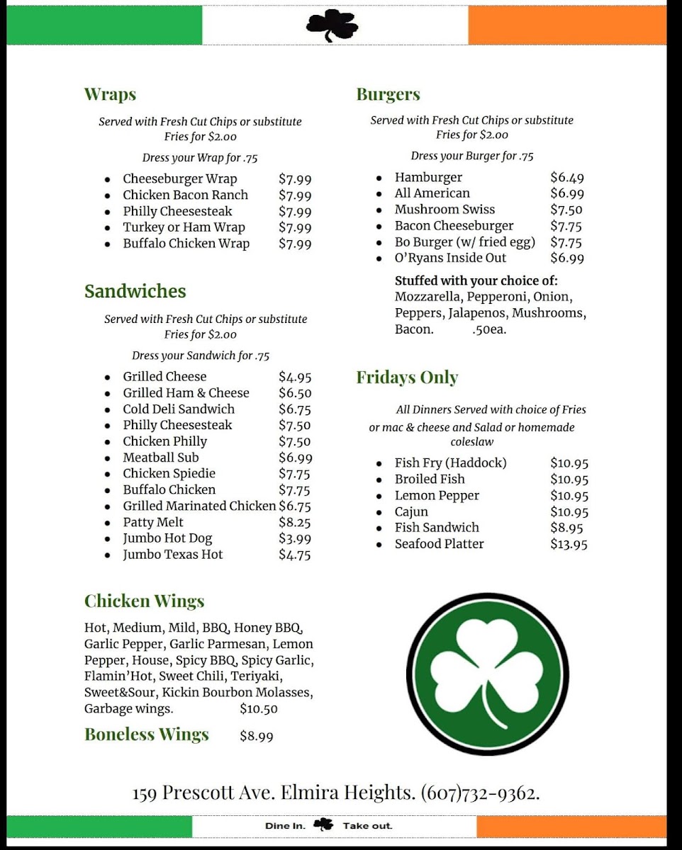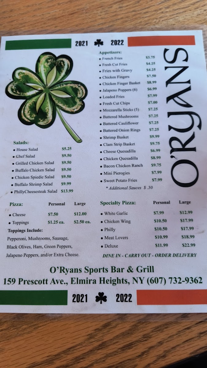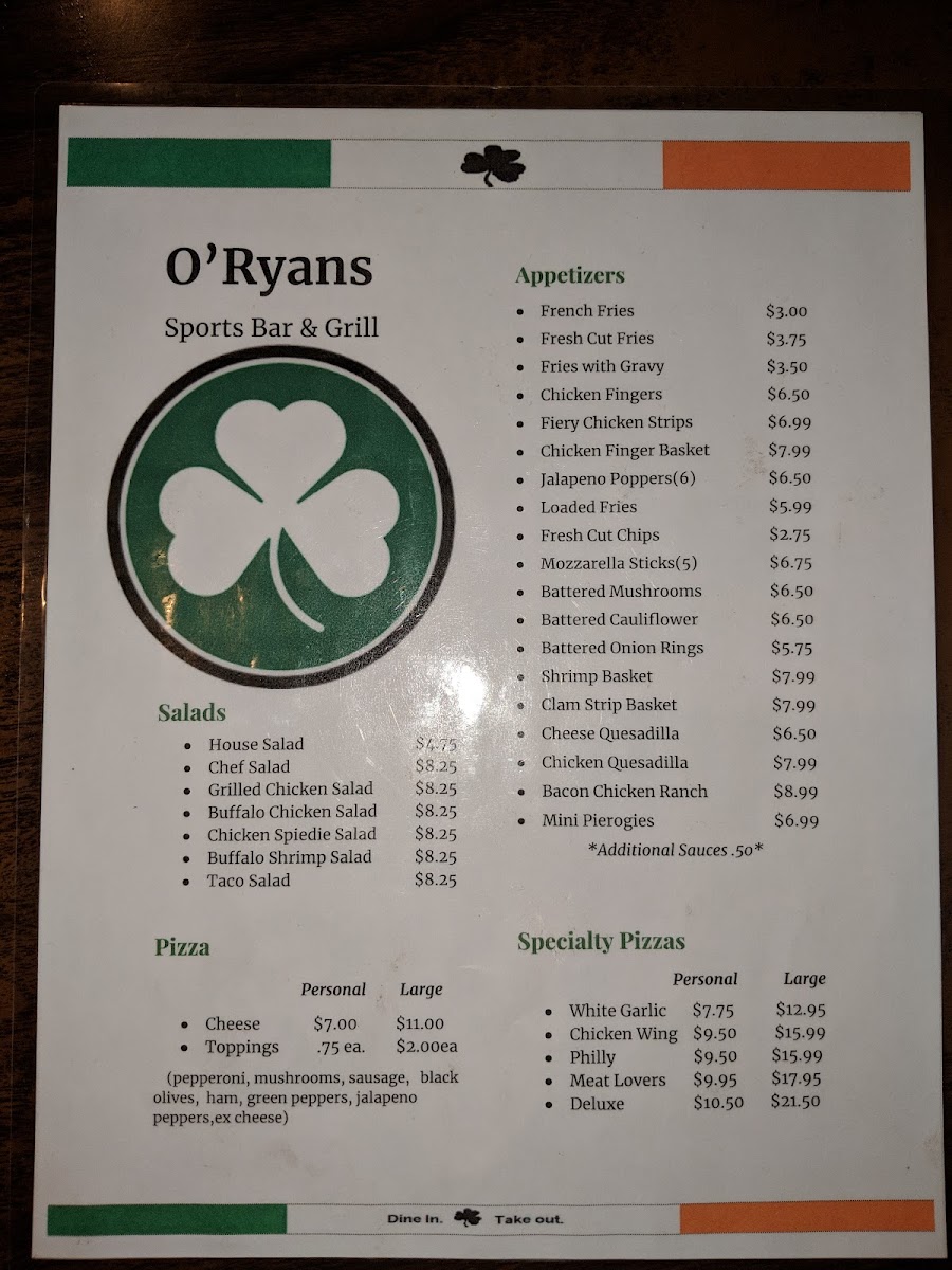 The menu at O'Ryans Sports Bar And Grill offers a straightforward selection of hearty and familiar dishes, perfect for casual outings and relaxed meals. The focus is on classic bar and grill fare with comforting sides and satisfying portions that feel right at home in a laid-back setting.