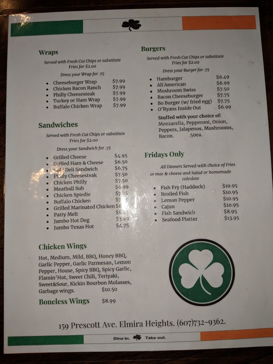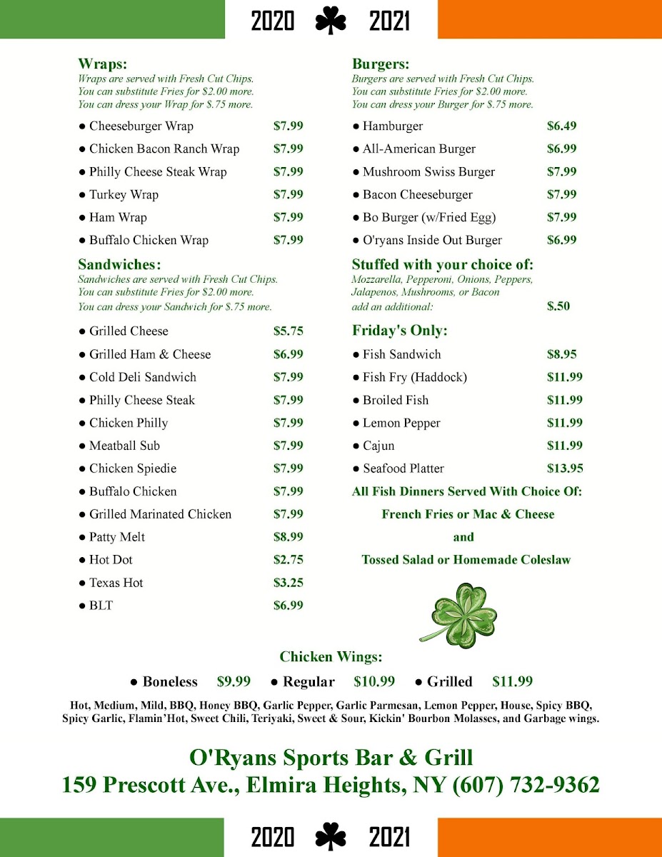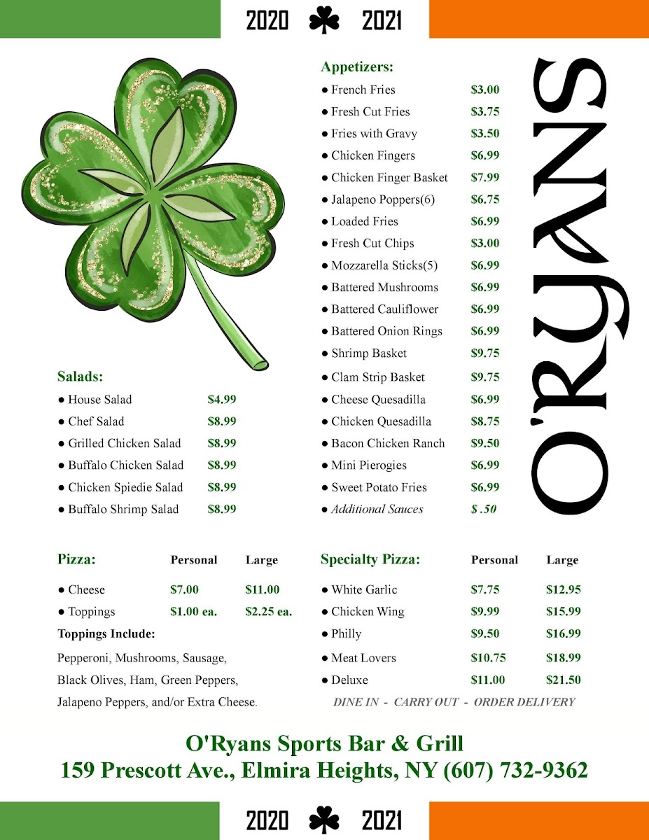 The menu at O'Ryans Sports Bar And Grill offers a straightforward selection of hearty and familiar dishes, perfect for casual outings and relaxed meals. The focus is on classic bar and grill fare with comforting sides and satisfying portions that feel right at home in a laid-back setting.